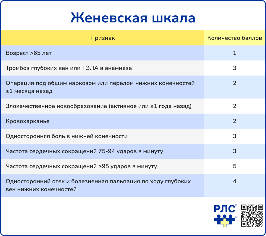 Описание: Женевская шкала используется для оценки клинической вероятности тромбоэмболии легочной артерии (ТЭЛА). Чем больше факторов, предрасполагающих к возникновению тромбоза глубоких вен и ТЭЛА, а также симптомов и признаков, характерных для данных состояний, тем более вероятно наличие легочной эмболии.